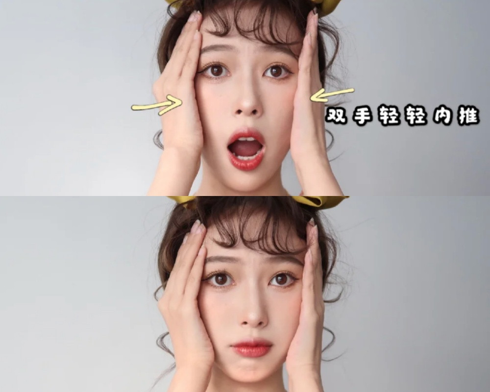 接著雙手輕輕向內推,並且在內推同時搭配口部開合,直到臉部有酸脹臉為止。一開合為一組,這一步每天做20-30組,能夠幫助矯正骨相上的不對稱。