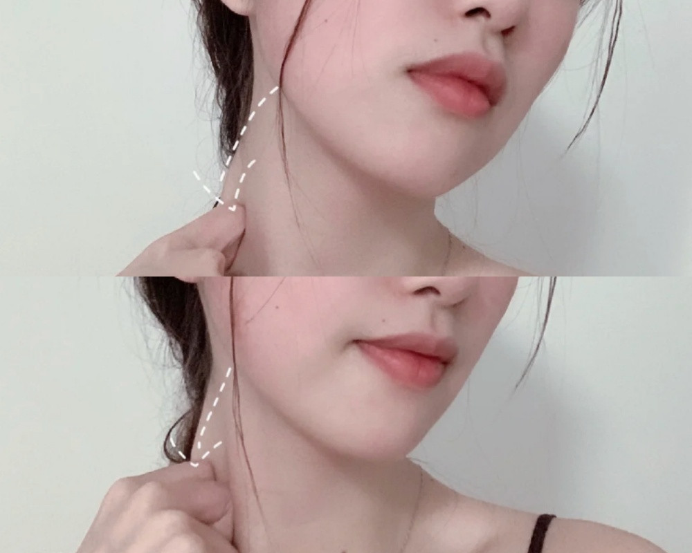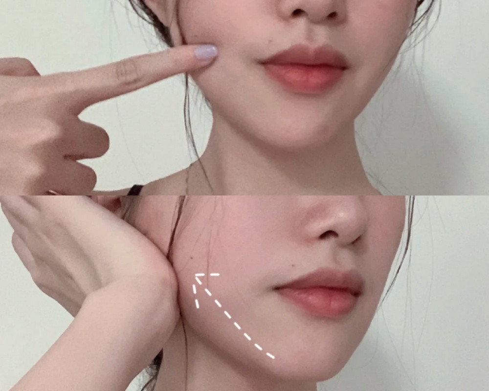 首先將食指和中指彎曲,並用兩只關節壓住下巴,慢慢提拉到耳朵下,並在咬肌處稍稍用力按壓,左右臉各按摩10次!這一步能夠讓下頷線條變得更明顯,也讓視覺上提拉臉部~
