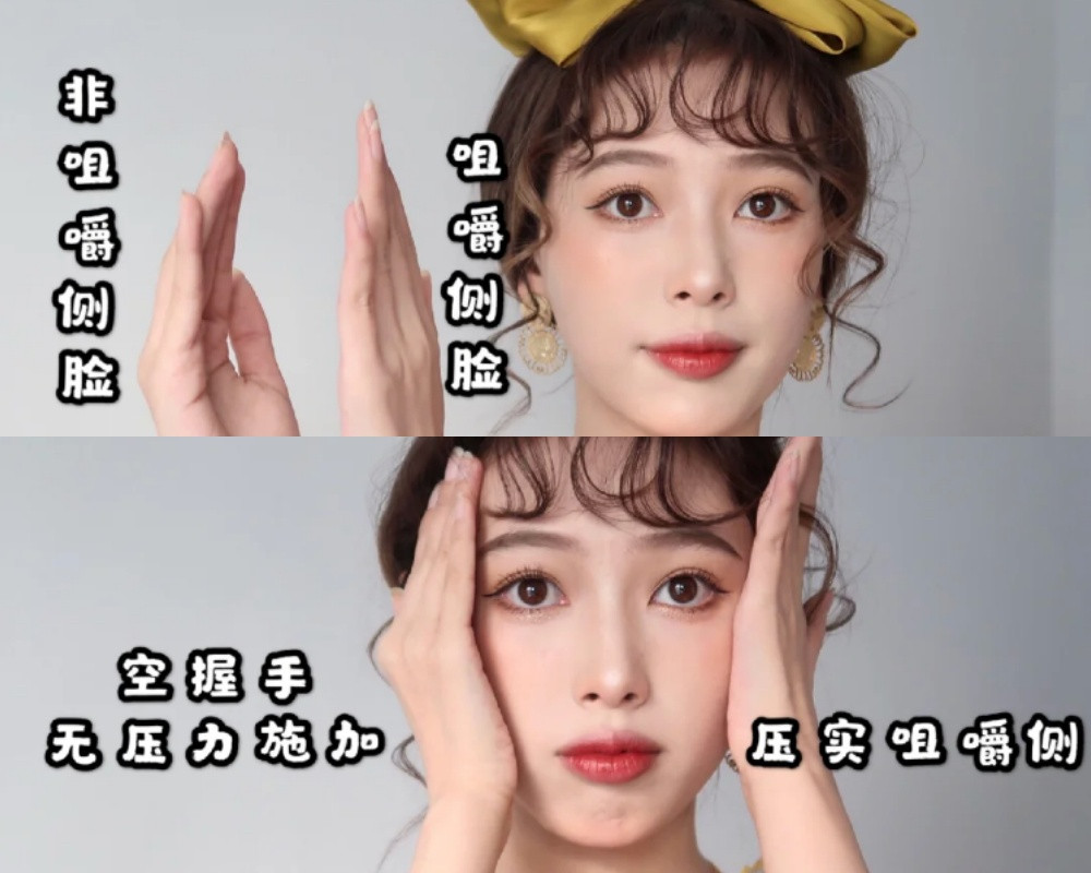 首先第一步就是要改善因為姿勢不正確、單邊咀嚼造成的臉部不對稱~先對鏡子確認臉部較突出一側(咬肌慣用側),手部直立平貼在耳朵兩側顴骨,另一手則呈微彎曲狀輕貼即可。