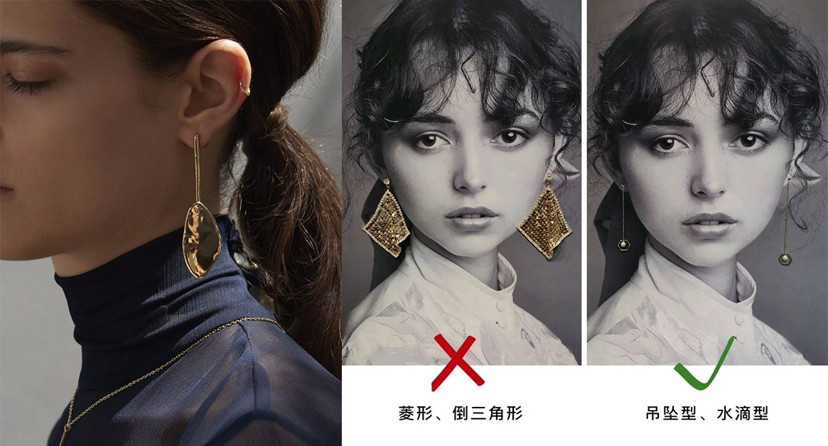 針對兩頰顴骨較凸出的菱形臉女孩,想要修飾粗硬的臉部輪廓,可以選擇上窄下寬的圓弧狀耳環,例如垂吊型、葫蘆型等,但切記耳墜的長度不要超過下巴,並且避開菱角輪廓較剛硬的耳飾,才不會讓凸出的顴骨加倍放大哦~