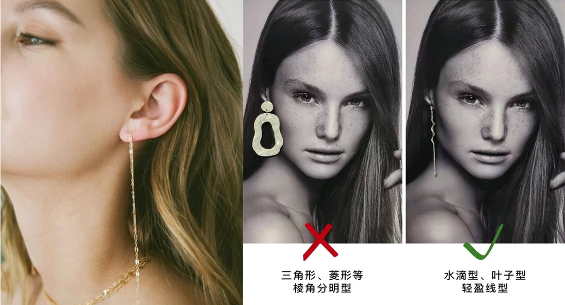 大餅臉、國字臉對於方臉女孩來說,這些暱稱真的是她們心中永遠的痛!剛硬的臉部輪廓不只在妝容上要格外用心,在飾品的挑選上更不能馬虎!為了修飾妳粗曠的骨骼線條,在選擇上最好避免長度垂吊至臉頰下且有菱有角的款式,尤其是三角形、五角星型更會加深方臉的視覺輪廓!最好的選擇是以水滴型、不規則型等輕盈款式,不只能柔化妳的臉型,也能使造型更輕盈。