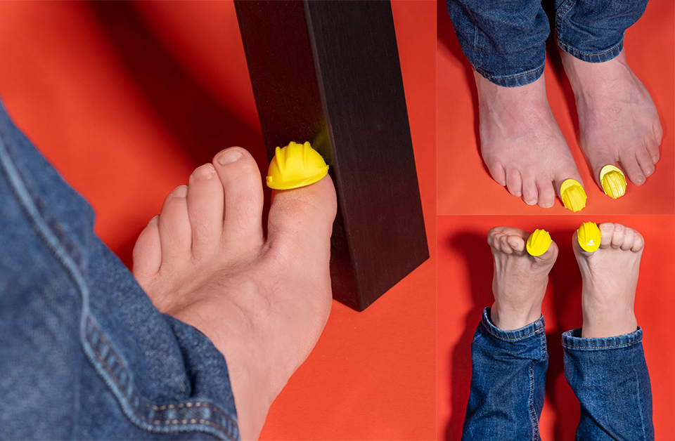 你一定也有過在家打赤腳時,腳趾頭撞到桌角的經驗吧!那個痠到骨子裡的痛感就連儂編現在想起來雞皮疙瘩都掉滿地 ~ ( 抖 )《Unnecessary Inventions》看準了民眾的需求,設計了這款腳趾安全帽!頭部需要保護,當然腳趾頭也不能馬虎,超迷你黃色工地安全帽,完美包覆你的指尖,就算在家踢到椅腳也不用再痛得打滾,先不論實用性與否,這個獵奇的創意,真的笑料一百分 ~ ( 噗 )