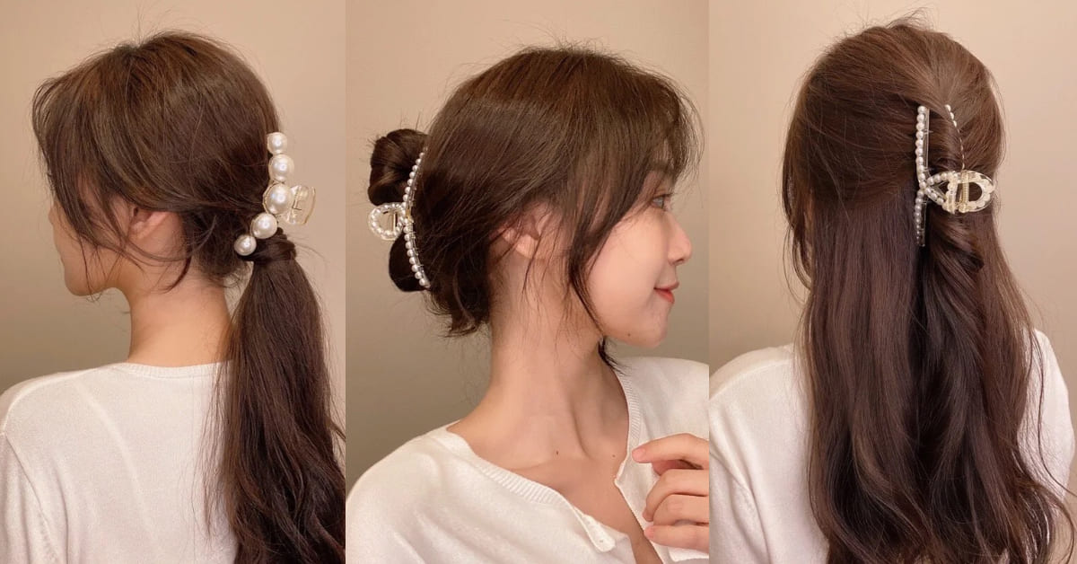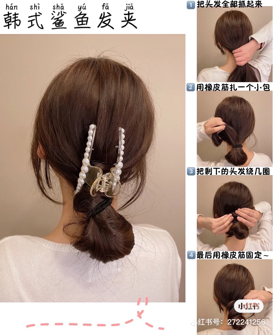 再來第三招可說是韓妞們的變化款!想要讓造型多點俏皮感,可以將丸子頭搭配鯊魚夾!首先將頭髮紮出一個丸子頭,接著把剩餘的髮絲繞上丸子,最後再搭配鯊魚夾固定即可大功告成~圓潤的丸子搭配鑲有珍珠的法式更顯典雅不隨便。