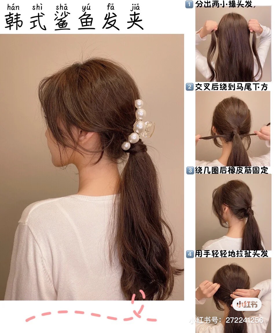 想要修飾你的圓潤臉,害怕包頭髮髻顯臉大的你,可以試試這款低馬尾造型!首先抓出耳際兩邊兩小搓髮絲,接著紮好低馬尾後把髮絲繞上髮絲遮蓋髮圈,最後再使用大鯊魚夾固定裝飾,無須技巧30秒搞定。