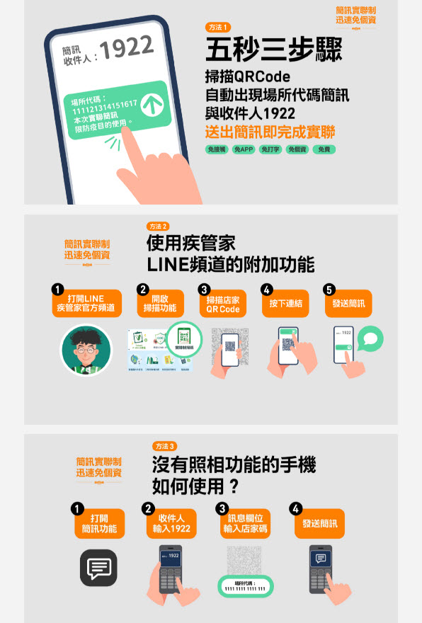 「簡訊實聯制」一共公開3種使用方式,包含利用手機相機或QR Code APP掃碼、使用疾管家Line的掃描功能,與直接透過手機簡訊功能發送。