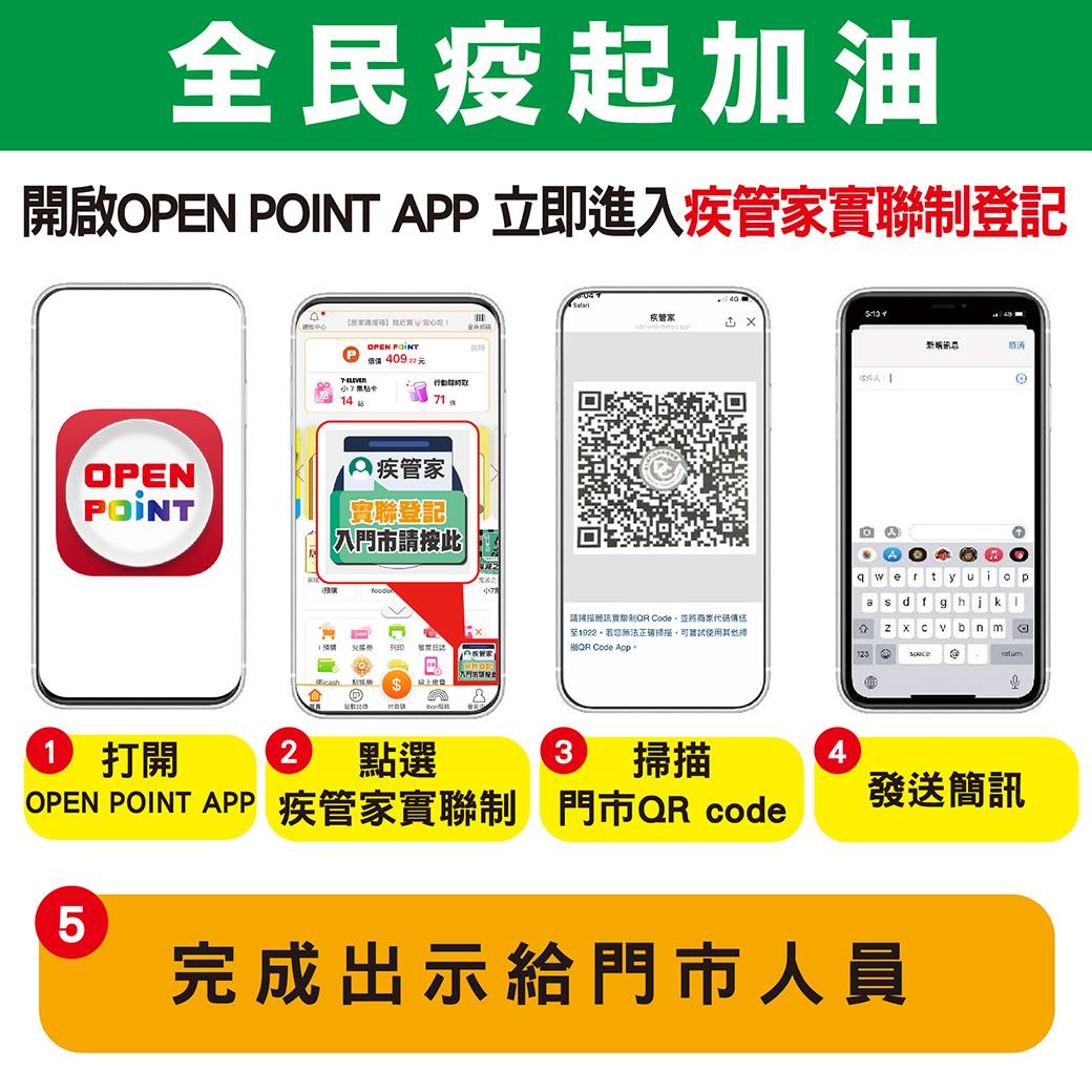 「簡訊實聯制」正式公開後隨即被不少單位採用,如7-11可透過OPEN POINT APP快速連結至疾管家Line掃碼。