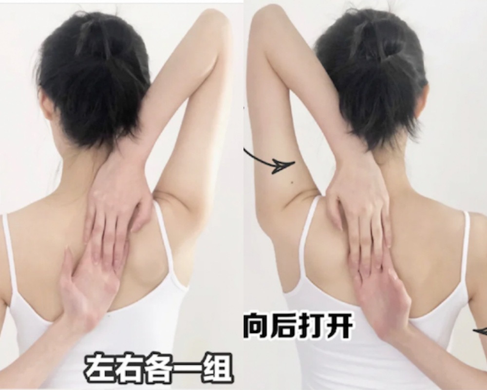 接著一樣雙手握拳、雙臂向兩側展開,手臂用力向後擠壓肩胛骨,直到感覺到大臂的拉伸感為止。這組動作每天做20次。這一步除了可以訓練到手臂內側的贅肉,還能幫助開肩、減少駝背跟厚背感,也能讓肩頸更加放鬆!