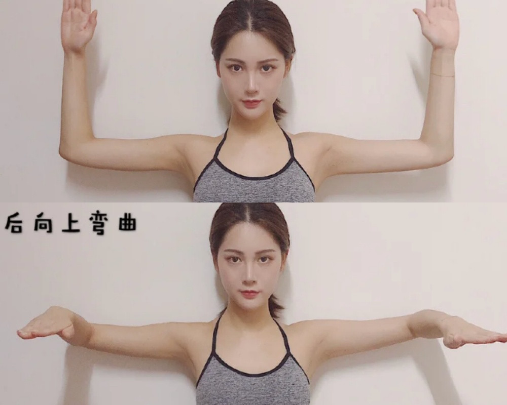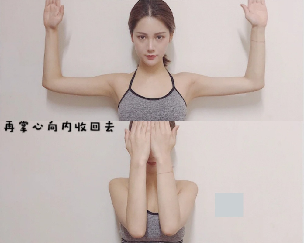 接著雙臂一樣呈現90度直角彎曲,雙手向兩側平行打開,接著小臂向內併攏。每天做20次。這組動作除了幫助緊緻整體手臂贅肉之外,還能消除副乳、訓練胸肌,有虎背、上半身肥胖困擾的人必做!
