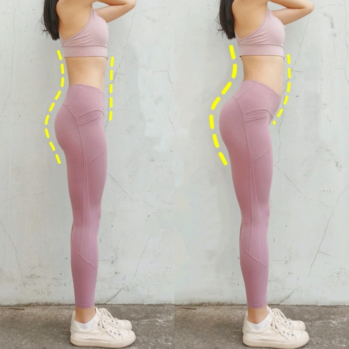 很多人因為坐姿、或是走路姿勢不良都有骨盆歪斜的問題,除了骨盆前傾、還有骨盆後傾,骨盆後傾歪斜會連帶導致大腿前側突出、也就是所謂的膝超伸,臀部也會有垂感,看起來讓腿更加粗短。