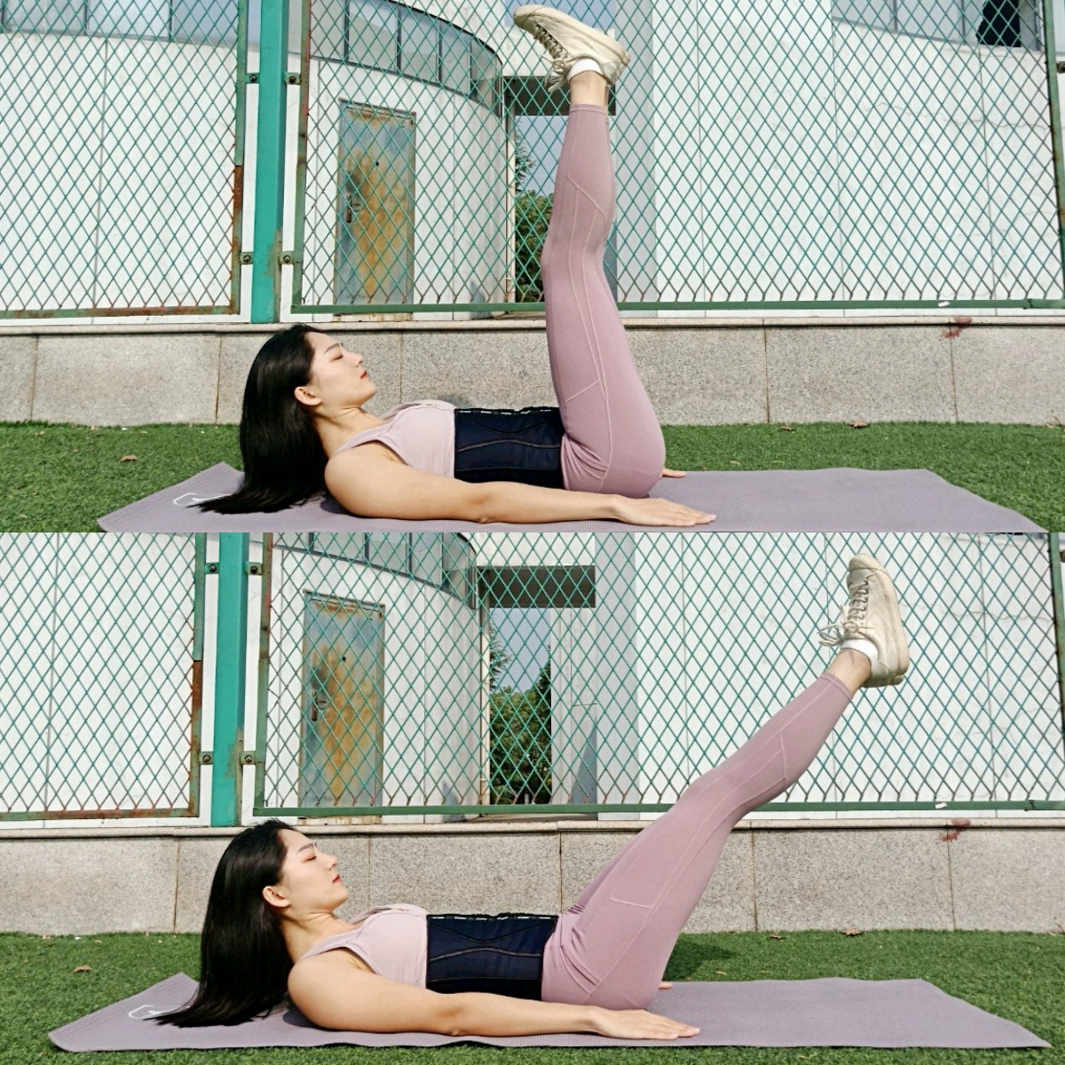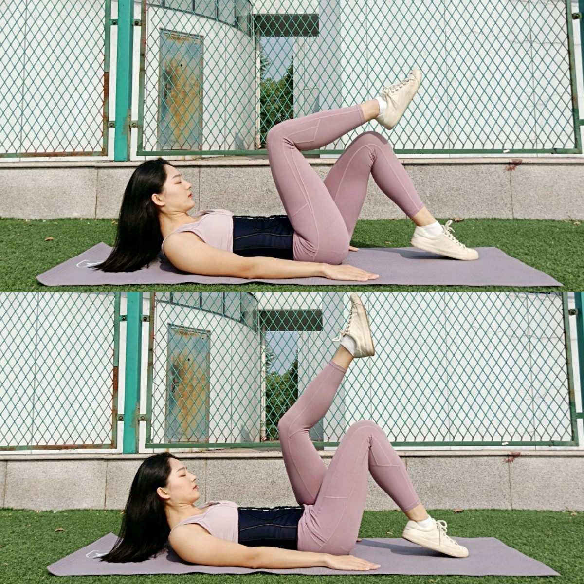 保持下背部壓實墊面,雙腳輪流交替點地,如果擡起上背部比較困難的話也可以躺下,但仍要注意下背部處於貼緊狀態。