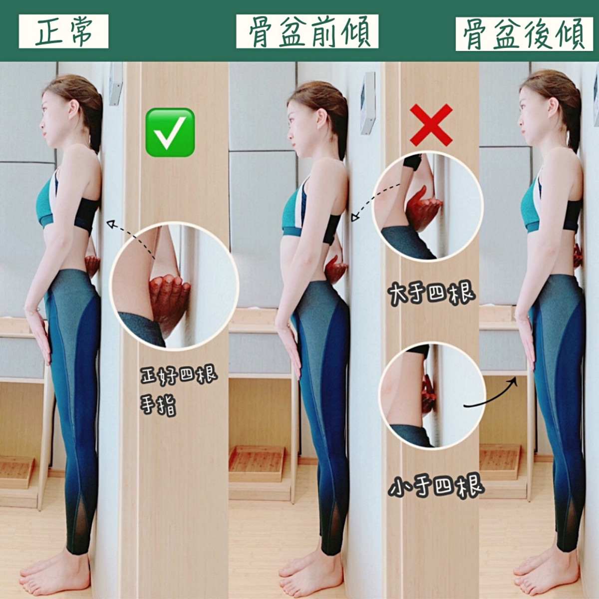 怎麼檢測骨盆歪斜問題?簡單的方式可以居家自我檢測,先靠墻站立,後腦勺、肩部、臀部、腿部、後腳跟5點靠緊墻面,接著將手的四指並攏放置腰後,看一下腰部和牆面的距離,腰部和牆面距離正好四指的話骨盆正常,大於四指則有骨盆前傾,小於四指的話則有骨盆後傾的問題。