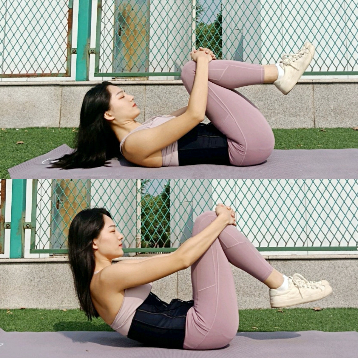雙手抱住雙腳膝蓋,利用身體的慣性和腰腹力量前後滾動,放鬆整個下背部,每組16次,這個動作可以加強臀部、腹部、大腿後側的肌群,有很高的運動效果。