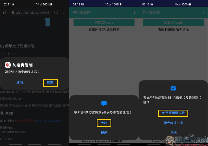 首先,可前往 SHXJ 的部落格下載「防疫實聯制」App( 點我下載(藍奏雲) | 點我下載(GoogleDrive))。接著在 Android 手機安裝應用程式,為了能直接完成 QR Code 掃碼和直接傳送簡訊,這裡需要允許「防疫實聯制」App 的相關權限: