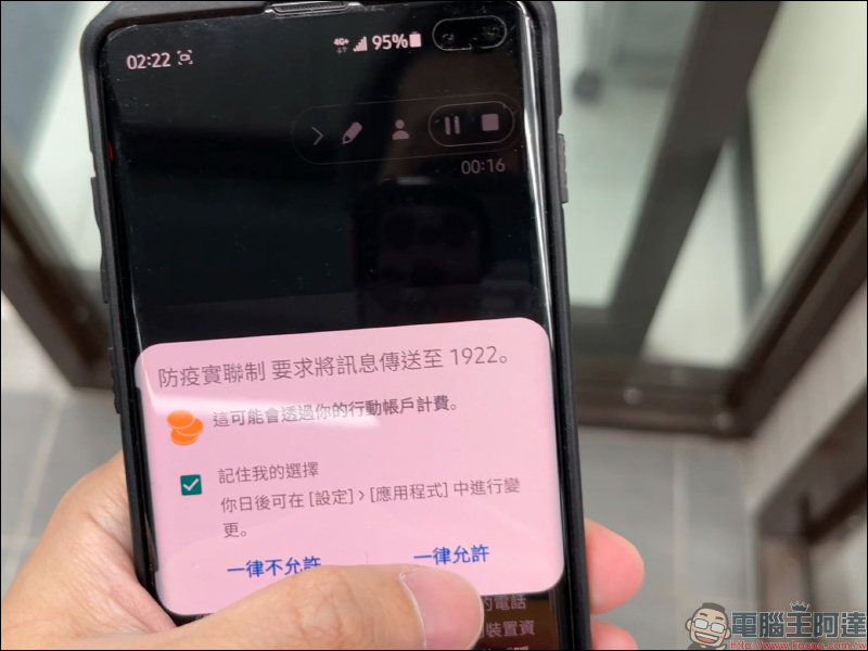 在首次完成 QR Code 掃碼後,畫面會跳轉顯示「是否傳送簡訊到 1922」的視窗,這時需要先打勾記住選擇並按下「一律允許」,這樣才能再之後掃碼後都能自動發送簡訊。(這步驟只有第一次需要點選)