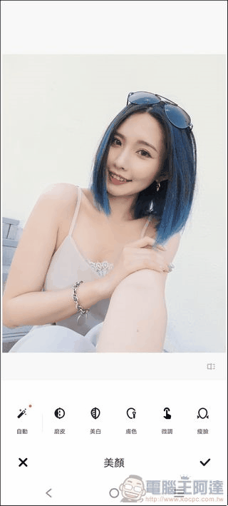 首先是日間正常光線底下的自拍,所有皮膚的瑕疵都非常自然的消失了,而且還保留了個人特徵痣: