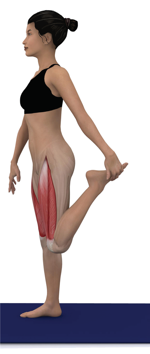 「股四頭肌」由四條肌肉組成;股內側肌、股中間肌、股外側肌與股直肌,位於大腿前方,為了讓腿部達到完全拉長與柔軟度,必須使其伸展。挺直站立不傾斜或搖動,可以幫助增進平衡。