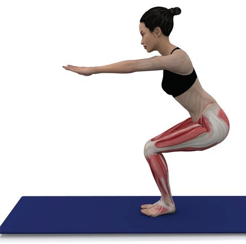 - 腹部肌肉往內縮屈膝半蹲,腳跟放於地面,背部打直,避免駝背,停留3-5秒。