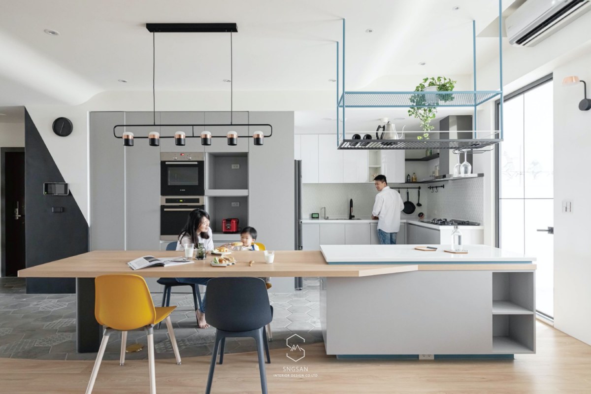 如果說開放式的優點是空間寬敞,缺點是油煙以及隱私,那玻璃拉門+一座中島就能解決所有問題!本案的公領域寬闊,而廚房設計在餐廳側方,不會直接對應到家人,在廚房部分設計玻璃推拉門,讓其有防油煙的實用機能同時保有開放式的視覺效果;另外在廚房與餐桌之間也增設中島,讓屋主也能利用中島與家人共同製作輕食,可說是兼顧機能與聯絡感情之設計,但其限制就是需要有夠大的空間才行。
