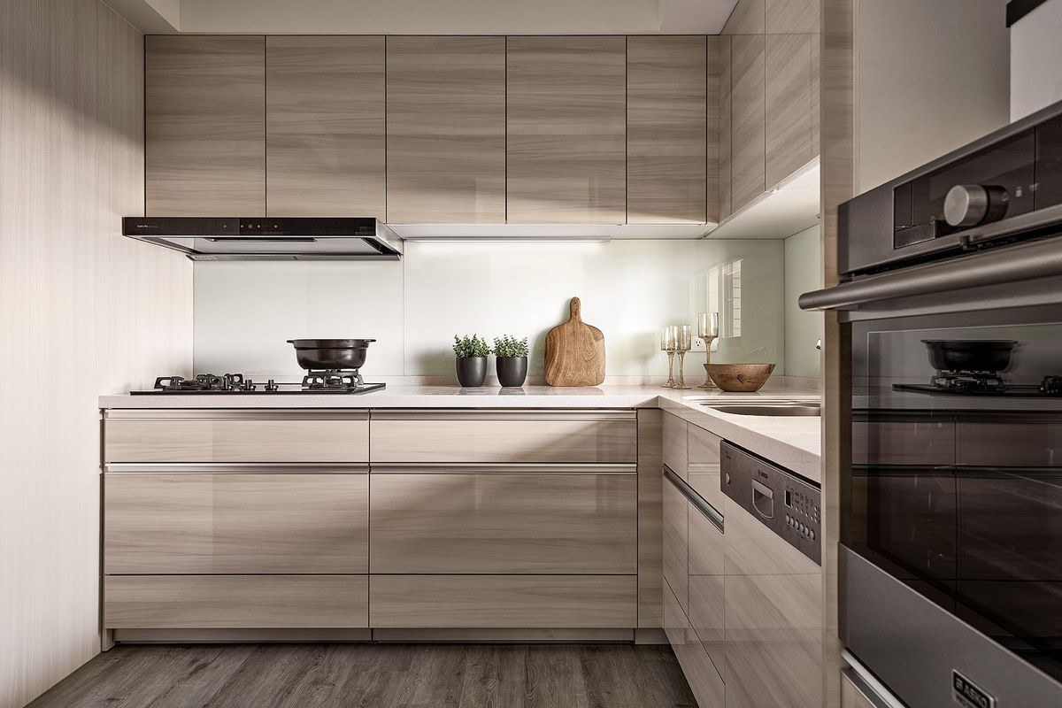 L型廚房算是一般小家庭很實用的類型,因其適合適合安置在轉角,以及收納機能足夠的特性,在出口處擺上一張餐桌就擁有完整的廚房機能。如果是採取開放式設計,通常就不再會搭配中島;若是半開放設計,很長像圖中一般家庭的格局,安置在專屬廚房的隔間。