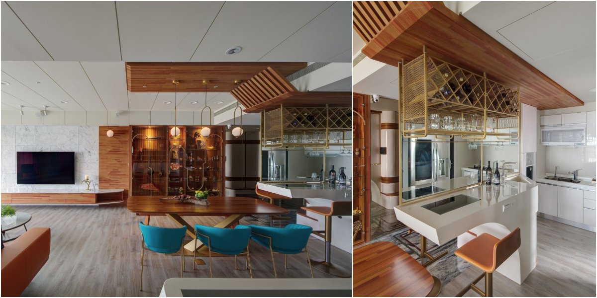 本案的開放式廚房另外增設中島,在開放式廚房中,一字型+中島是很常見的,因為一字型簡明單一的設計讓空間一目瞭然,但同時也較缺乏收納的機能,因此增設的中島除了能充當飯桌、簡單調理的吧台,本案上方的懸掛式酒櫃也顯現屋主獨有的品味。