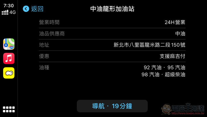 加油站的 CarPlay 體驗也很類似,除了方便的營業時間外,也會標示是否支援最新的加油站麻吉付: