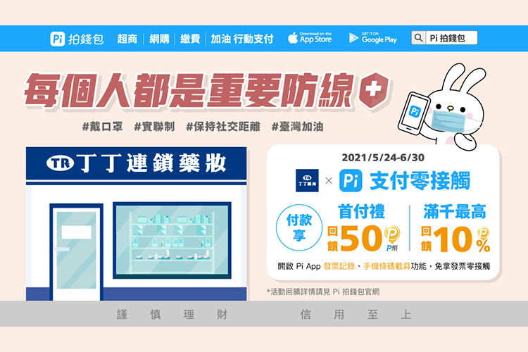 使用 Pi 拍錢包App綁定任一信用卡,於丁丁連鎖藥局首次付款不限金額,且該筆交易為 Pi 拍錢包App註冊完成後首筆交易,即可享50 P幣回饋。