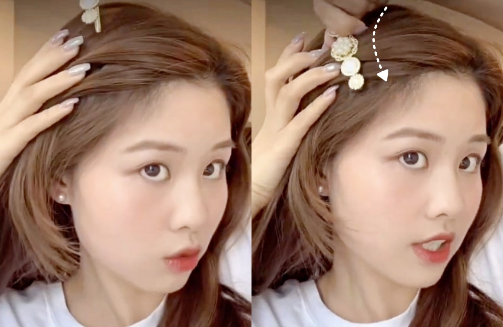 正確戴法應該是先用手將瀏海撥順,可以先往反方向吹一吹、讓髮根更加蓬鬆,接著按住瀏海、稍微往反方向推後,再將髮夾開口往前夾上。