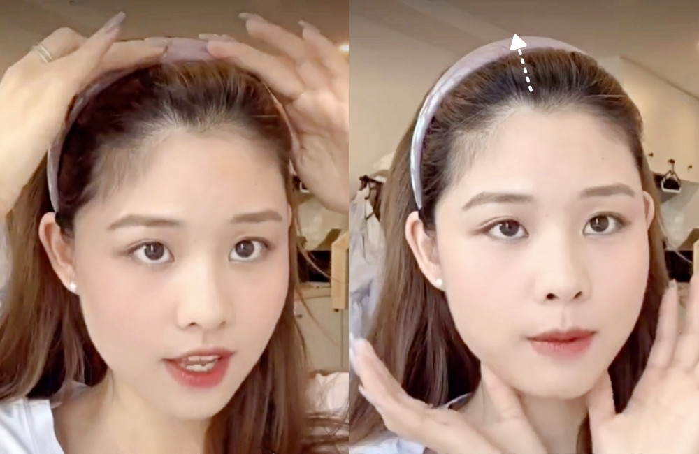 最後就是夏日常戴的髮箍、髮帶,一般直接這樣壓下去、顱頂變的超級低,臉看起來也顯大、肉臉完全遮不住。