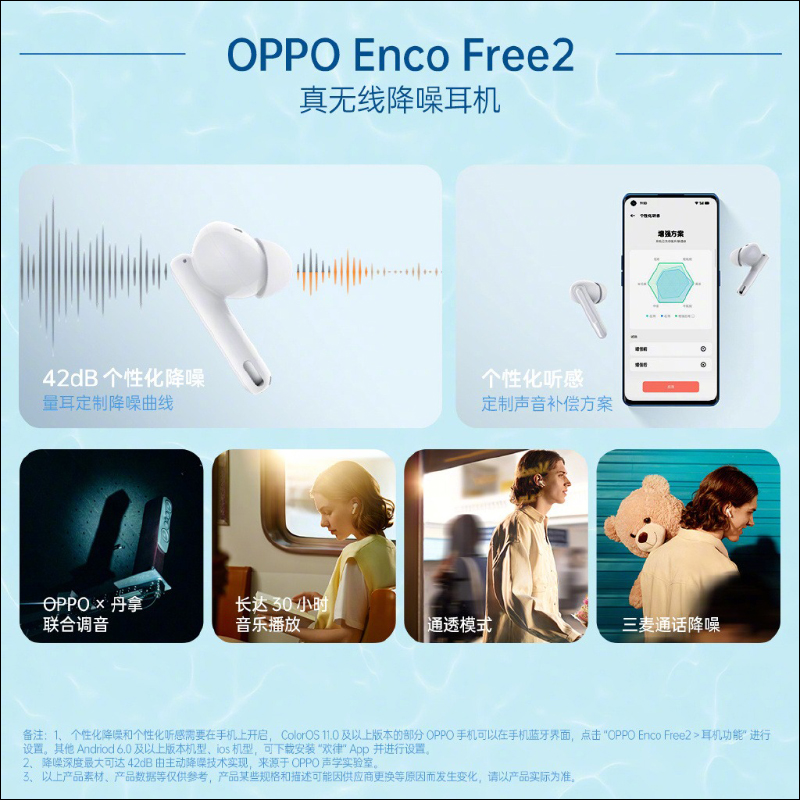 OPPO 也在發表會正式亮相了 OPPO Enco Free2 真無線降噪耳機,耳機搭載三核降噪晶片可提供最高 42dB 的降噪深度。另外, Enco Free2 也提供個性化降噪模式調整和通透模式。