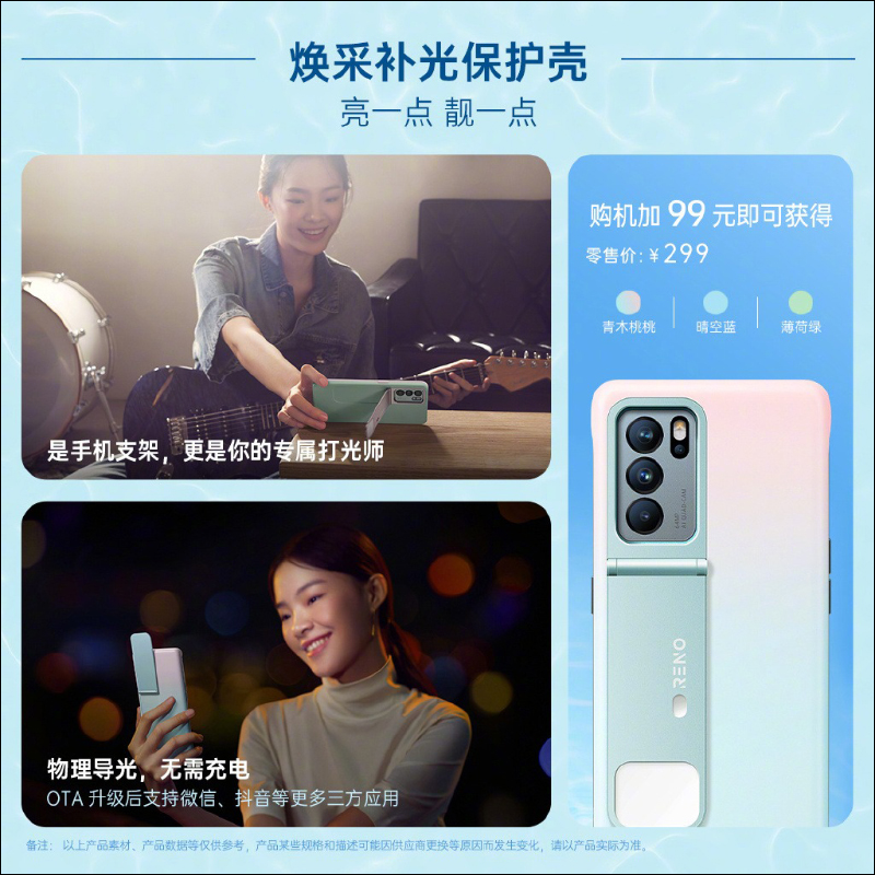 搭配 OPPO Reno6 系列新機,這次 OPPO 也推出了 Reno6 系列煥彩補光保護殼,內建自拍補光燈和手機支架功能讓自拍補光或追劇都能輕鬆駕馭。 OPPO Reno6 系列煥彩補光燈也無需充電、能智慧調節補光燈的亮度。
