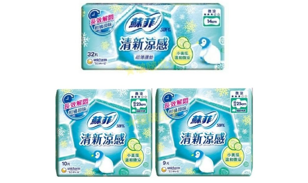 回購率也很高的蘇菲涼感衛生棉,添加天然小黃瓜精華,對肌膚溫和、少刺激,含天然柑橘清香,減少異味擔心,超吸收表層能大量吸收、安心防漏,搭配專利密封單片包設計,長效維持棉片涼感。如果喜歡享受超涼感的妞妞,可以參考同品牌的清新涼感清涼薄荷系列,涼感指數5顆星!