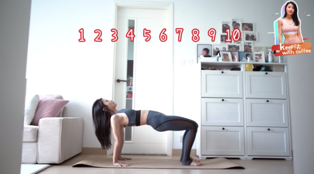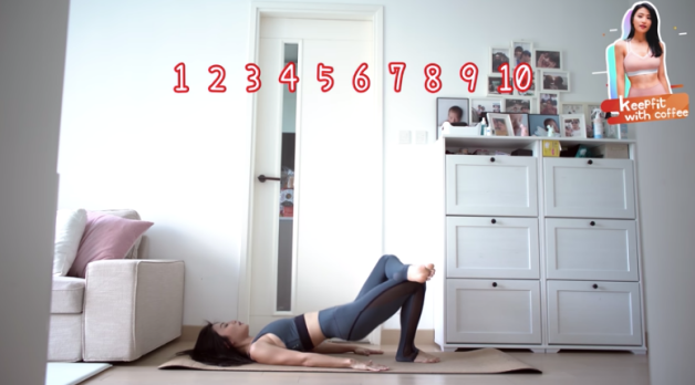 中階版本是臀部抬上去時打開膝蓋,各做10下,進階版本是臀部抬上去時上面的腳也一起舉高,各做10下;最後一個魔鬼版是臀部抬上去時雙腳伸直上腳抬起,也是兩邊各做10下。