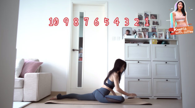 坐在地上一腳向前彎曲,一腳往後伸直保持10個呼吸,接著將上身向前,維持10個呼吸後換邊;將雙腳腳掌向內併攏,壓下胯的部位維持五個呼吸,接著加上上身360旋轉,左右轉各五5次;最後一個動作坐著將雙腳打開成一字狀態,腳尖對著天花板,將骨盆慢慢推向中間維持10秒,維持同樣的姿勢身體向左右伸展各10秒。