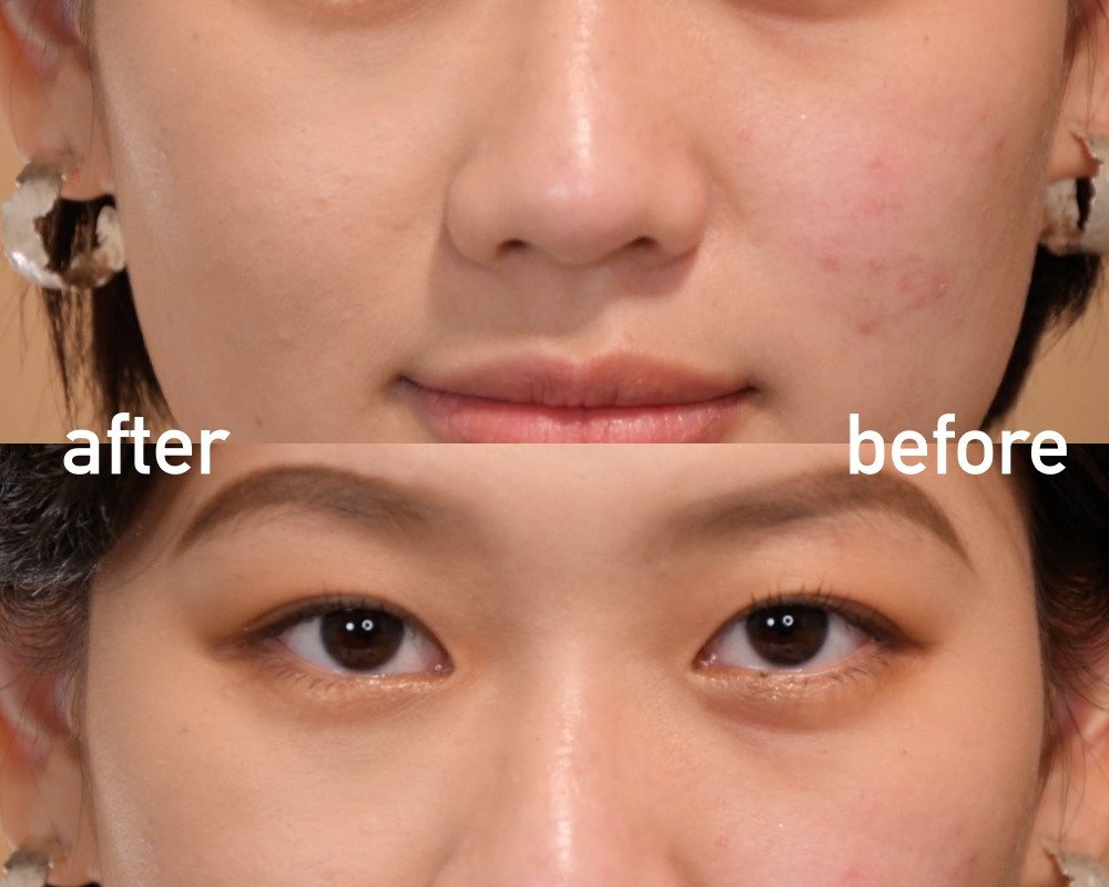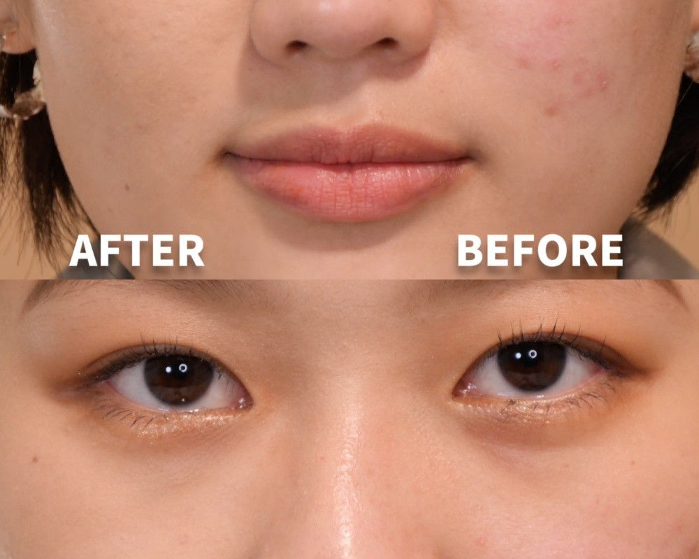 (右)P編:輕微酒糟,有痘痘、痘印痘疤,重度黑眼圈、眼下偏乾
