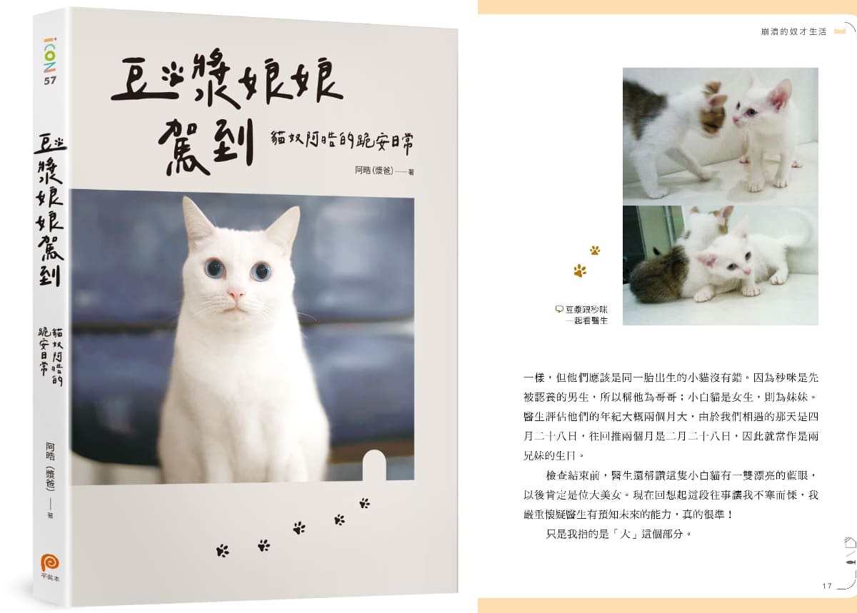 而有貓界網美之稱、逾67萬粉絲、每支影片都能創造百萬點閱的台灣超人氣YouTuber貓咪「豆漿娘娘」,首本寫真新書《豆漿娘娘駕到:貓奴阿晧的跪安日常》上市首週即攻佔誠品書店休閒趣味類暢銷榜第1名,書中分享「豆漿娘娘」如何從被領養到成為橫掃FB、IG、YouTube的網紅,也教讀者如何判斷自己適合養貓、分享養貓經驗等,是一本理性與感性兼具的貓咪書。