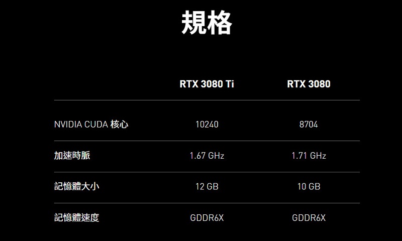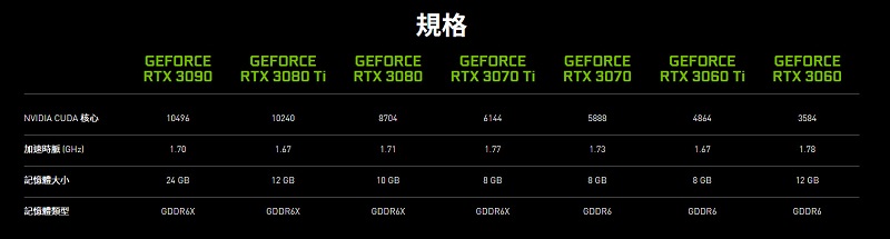 官網也有針對涵蓋GeForce RTX™ 3070 Ti等新顯卡在內,提供RTX 30 系列顯卡規格比較。