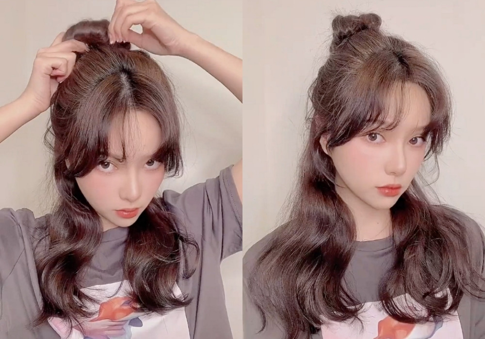 盤成丸子頭後直接用橡皮筋或髮圈固定即可,這個半丸子頭不僅非常甜美,也是一款很簡單的髮型、同時減齡顯嫩~