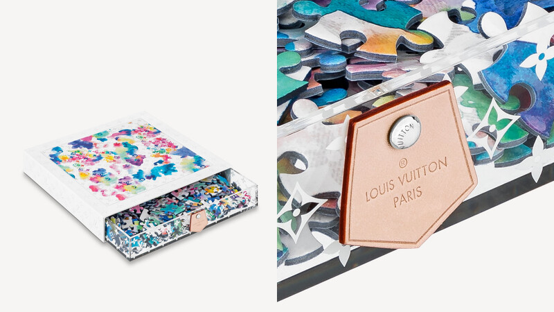 前兩個月,LV 發表的2021夏日膠囊男裝系列,以水彩暈染的手法詮釋夏天活潑的氣氛,而相同的水墨花色,路易威登還推出了拼圖組。從外包裝便可以感受到這一組拼圖與眾不同的奢華感——白色的LV Monogram紙盒印著拼圖的完成圖樣,內部的透明壓克力印著相同的花色並配上皮革貼片作為拉環。