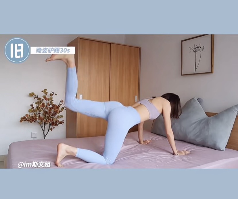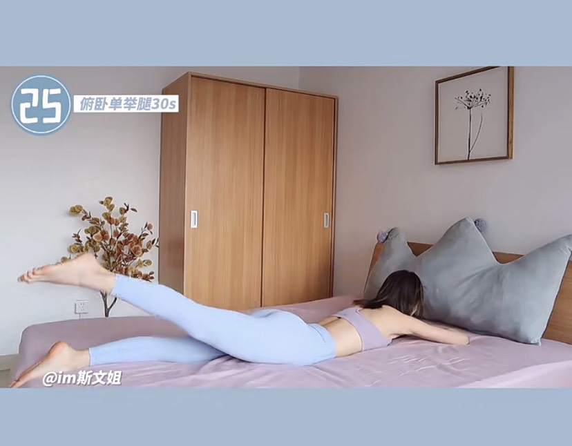 接著第三招,就進入進皆的單臀鍛鍊~同樣以趴臥的姿勢,在床鋪上躺平,以核心發力,將單腳像上台起,穩住臀部肌肉,連續動作30秒,而後左右交換各30秒。最後可以再搭配雙腿開合,將兩動作結合,連續30秒,強化臀部肌肉。