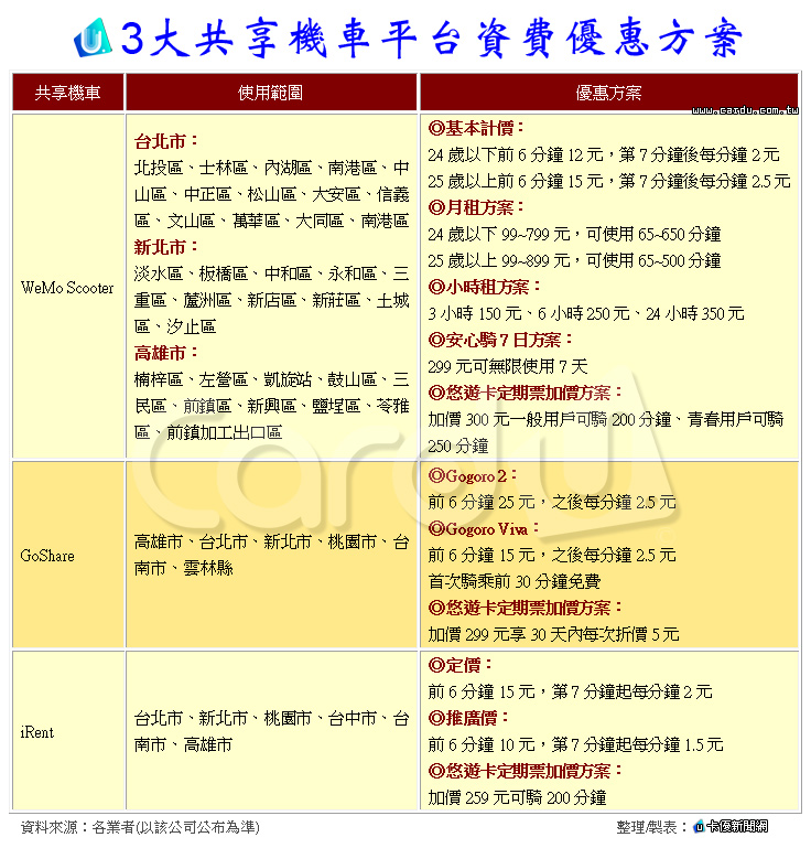 3大共享機車平台資費優惠方案,如下表: