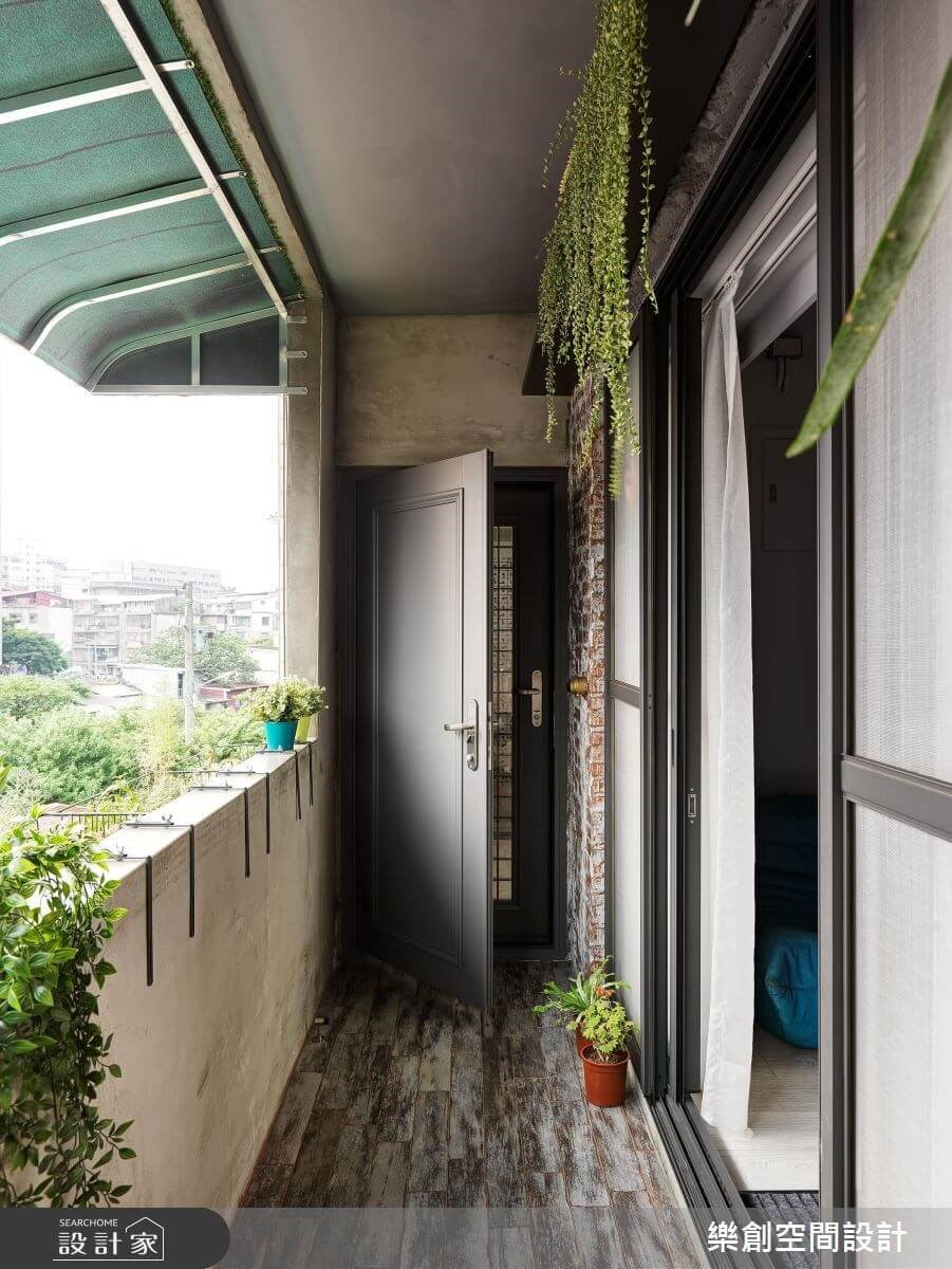 此狹長陽台為老公寓內常見的入門格局。玄關即前陽台區的設定,多作為鞋櫃收納或擺放戶外掃除用具為主。為延續老屋歷史,設計師讓地坪及壁面以仿舊磚材呼應,並重新規劃木質鞋櫃予以實用機能。此外,佐以鐵件框架讓綠植垂直落下的佈置,以沒有過多改造陽台格局的方式,替老屋換上復古又生氣盎然的門面,擺上椅凳對坐,隨時能轉換為愜意放鬆氛圍。