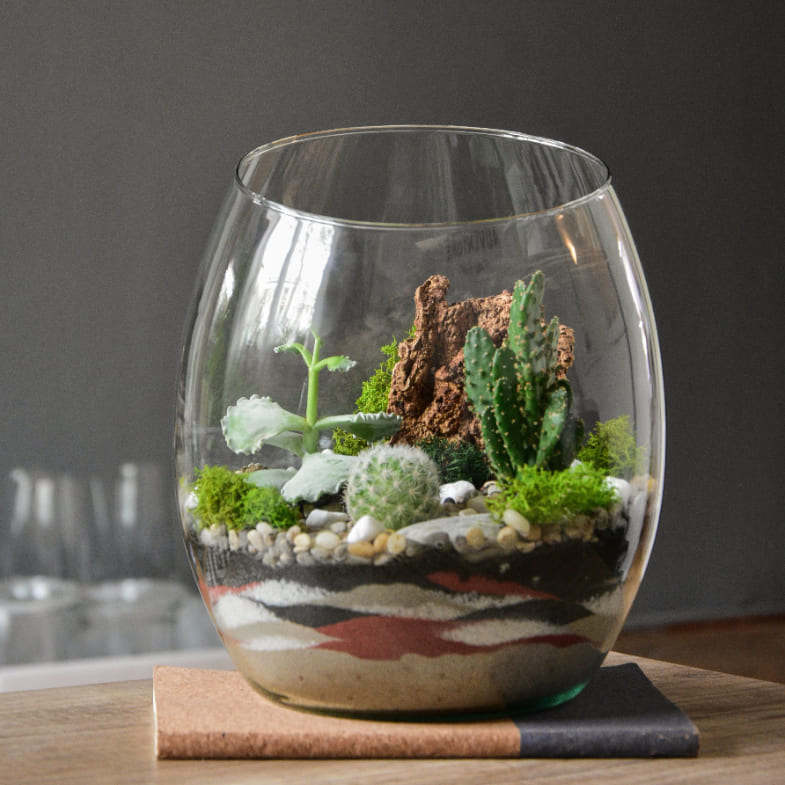 玻璃容器讓植物更像是一種「裝飾」,像美女與野獸裡那朵不停凋謝的玫瑰花一樣。若你不想耗費太多心力照顧這個裝飾,仙人掌之類的多肉植物絕對是最佳選擇。低透氣性的玻璃容器恰巧也最適合多肉植物,能依照自己的喜好在若在容器中添加不同色彩的沙子或小石子;若是大的玻璃盆,就能在之中安置多一點植物,讓它看起來有小型造景的感覺,也為空間增添不一樣的亮點。
