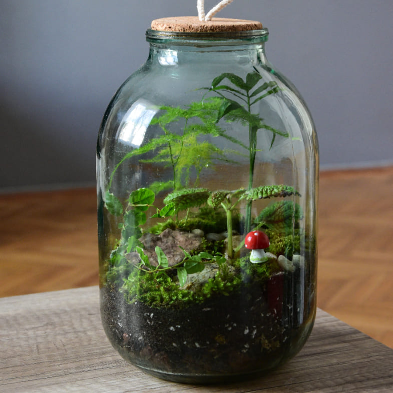「微景觀生態瓶」與剛剛的開放式玻璃瓶不同,它通常是完全封閉的,有趣就在於它是一個能觀察的小小生態,非常療癒。生態瓶多是種植需要潮濕條件的苔蘚植物,只要澆上少量的水後、密封瓶口,就能自己進行水循環,不須再費心照顧。厲害一點的生態瓶還能養進蝦子之類的小生物,這就不像是一個裝飾了,是一個擺在家中的小小世界。