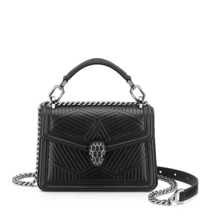 這款 Bvlgari 的「Serpenti Diamond」,不僅在衍縫上以特殊的鑽石紋路做設計,全黑的蛇頭更將整款包的帥氣指數拉到最高!金屬鏈帶同樣也呼應了全黑的包身,以銀灰色的色澤呈現。(商品售價:NTD92,500)