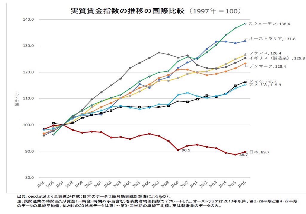 ▼只有日本的最低工資漲幅很小。事實就是工資一直在下降。其他先進國家都沒有這樣。
