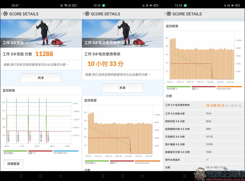 接著在 PCMARK 工作 3.0 效能實測獲得 11288 分,內建 5000mAh 大容量電池的 realme 8 5G 在工作 3.0 電池使用壽命測試則有 10 小時 33 分,能滿足一般人日常一整天的使用,快速充電功率則為 18W 。