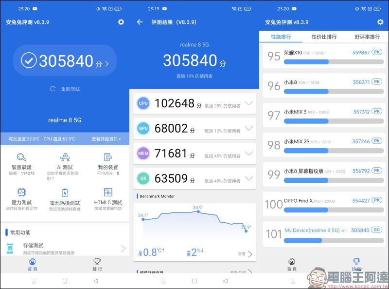 搭載聯發科天璣 700 5G 處理器的 realme 8 5G ,經過安兔兔性能跑分實測為 305,840 分。