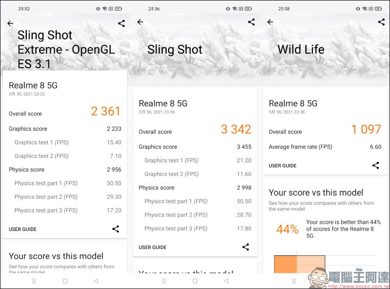 3D MARK 測試 Sling Shot Extreme 得到 2361 分、Sling Shot 得到 3342 分, Wild Life 則有 1097 分的表現。