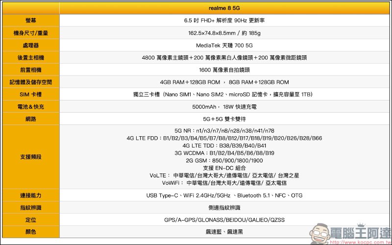 realme 8 5G 除了 5G+5G 雙卡雙待,覆蓋台灣主流頻段(完整支援頻段可參考本文末後段的 realme 8 5G 規格表)和 EN-DC 組合,讓預算有限的消費者也能輕鬆入手 5G 高網速的手機。