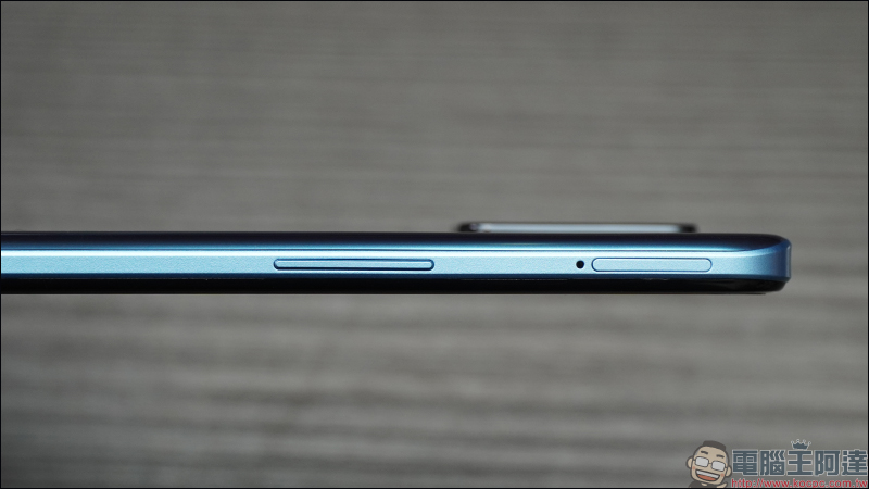 realme 8 5G 將音量鍵和 SIM 卡槽設計在機身左側,從這視角也能看出 realme 8 5G 相當輕薄,機身厚度僅 8.5mm 、重量也只有 185g ,很難想像它其實內建 5000mAh 大容量電池,卻仍保有輕巧的機身和適中的持握手感。